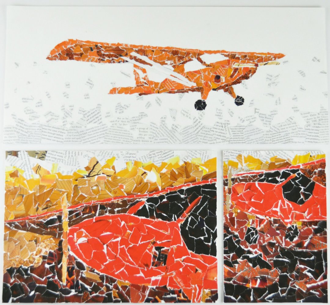 Thereby, the Italian futurists were an inspiration to me, as their goal was to capture the speed and movement of flying. Their use of line and abstraction depicted the movement of wind past a plane, whereas situating the subject of the image on an angle captured the adrenaline of taking off and landing. I was influenced to utilise angles in Adrenaline, Peace, Movement, Love to show this feeling. Although, collaging artists, such as Eileen Downes, were most inspiring to me. Her textured works, which incorporated images and words from magazines and scrap pieces of paper showed how something old can be made from something new. This reminded me of how my father’s love of flying, which he shared with me, has influenced my love of the sky. Thereby, collage was a symbolic technique which I intentionally utilised to harness its sense of movement through the torn edge and transient effect when representing objects.