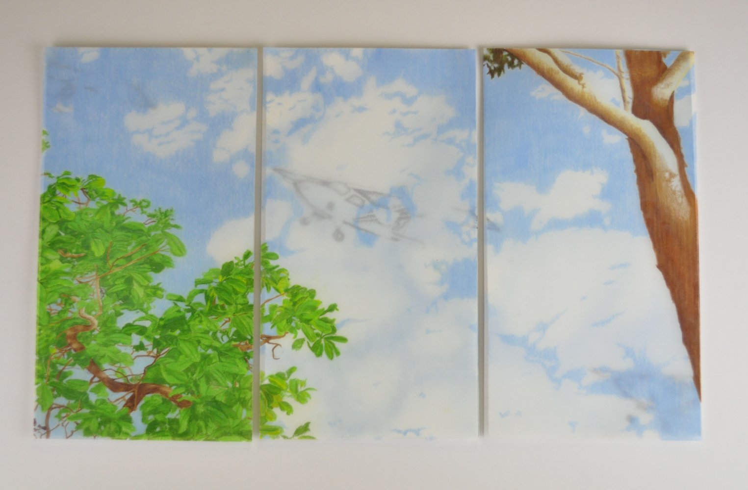 Successfully exploring the theme of perspectives through the creation of Transient Perspectives allowed me to critically consider how other people think and feel about the sky. Through layering each panel, exhibiting detailed pencil drawings of the sky on drafting film, abstracting watercolour on paper and printing shapes of my father’s plane and aero chute, I communicated the idea that one image can have different meanings to different individuals. Personally, I have improved my aesthetic when working with pencil and watercolour because of this artwork and expanded my understanding of composition through creating a panelled artwork.