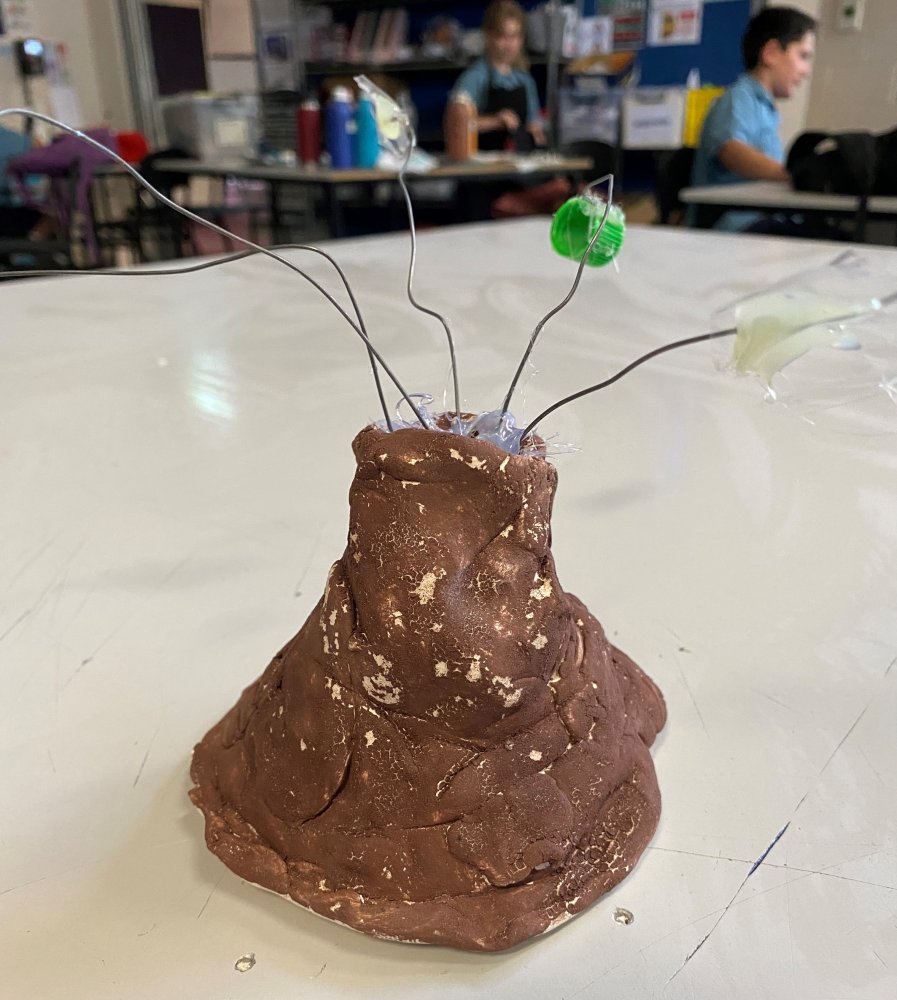 The elements and principles of art I have used are form, to make a sculpture, colour, by making the volcano brown and the rubbish coloured, and line, by putting metal wire to show the rubbish spewing out of the volcano.