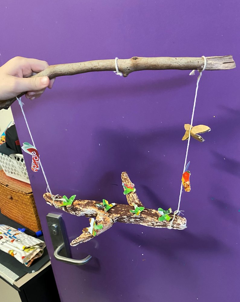 The artwork spreads the sustainability message because the butterflies are made out of recycled plastic or cardboard.