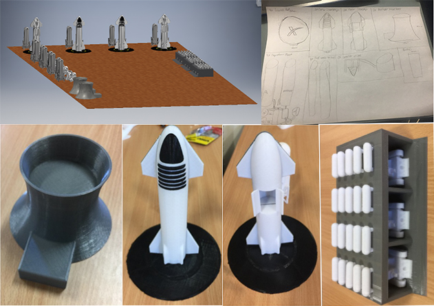 The production of the models began with the two Starship variants, the crewed Starship was produced first, and the cargo starship was produced using the crewed variant as a basis. This resulted in a similar overall design between the variants; assisting in printability as many of the bugs can be worked out before printing and not repeated. The next part developed involved the Launch and Landing Pads, which was developed by creating a circular base, tapering into a smaller circle at the top. The SpaceX (2021) logo was then traced onto the pad and cut out; this was done so that a different coloured insert could be embedded into the pad.