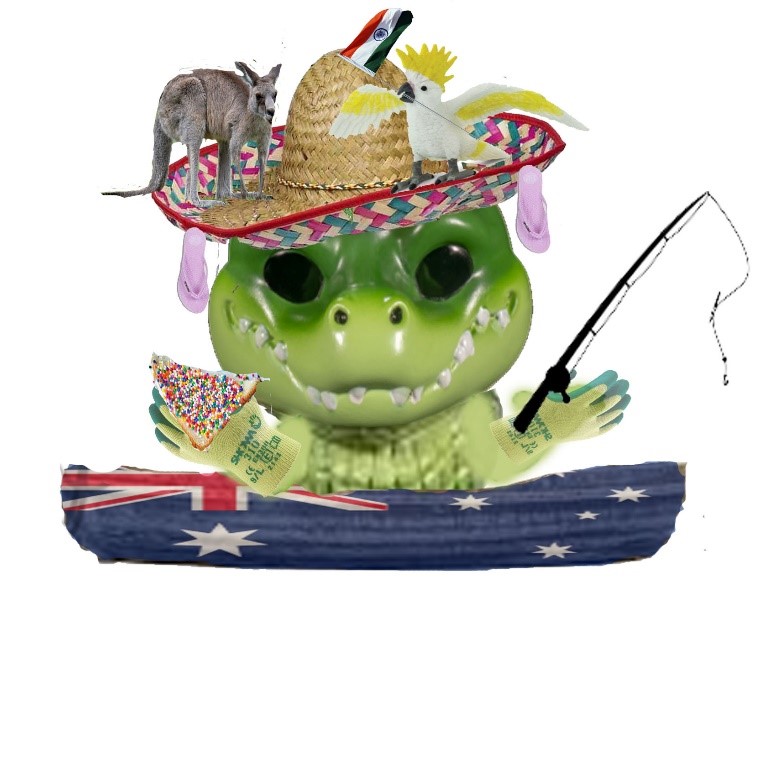 This is a crocodile who represents us as humans. Eating fairy bread relaxing and sailing whilst fishing. I did this because the NT is full of wonderful fish and sprinkles. I have also incorporated a cockatoo and a kangaroo because they are an Australian animal. The reason of the cockatoo holding an Indian flag is because I am Indian and staying in this country has been nice because of all of the encouragement and acceptance of people in the NT.